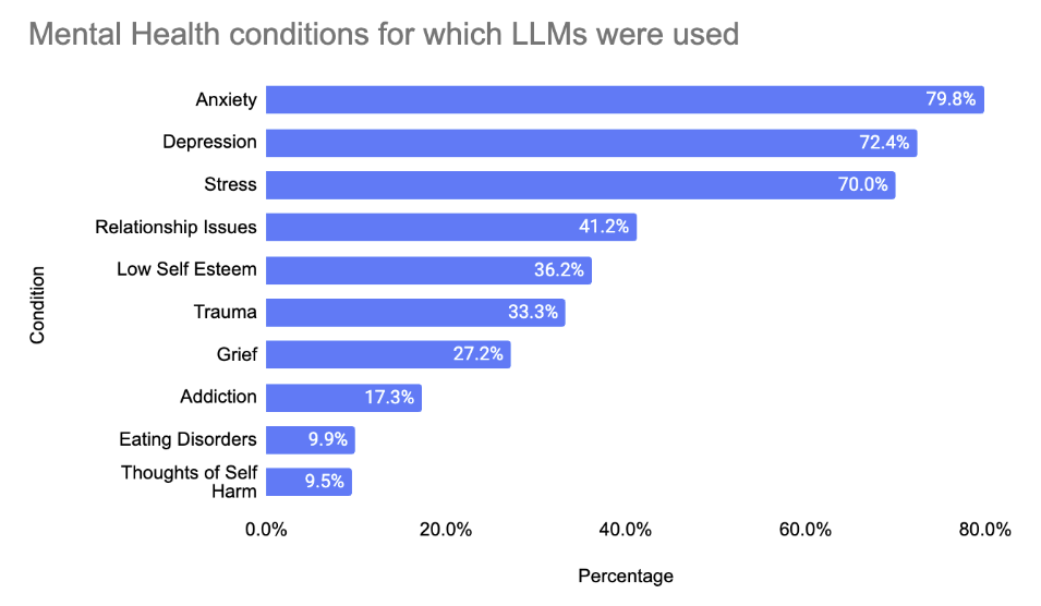 📈 80% use LLMs for anxiety management and 72% for depression support.