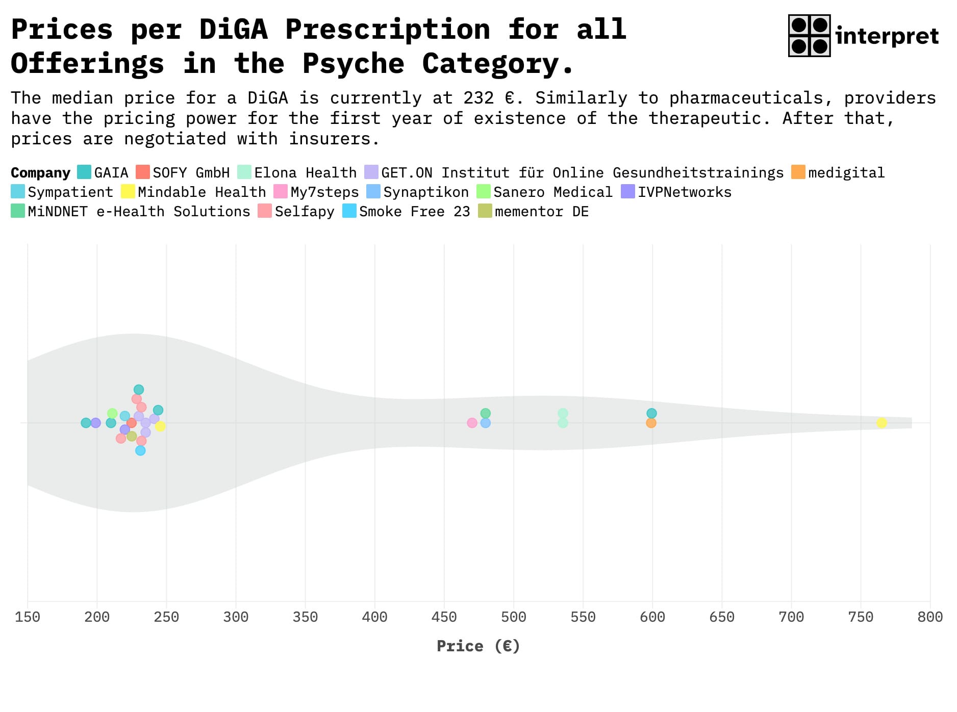 Preliminarily listed DiGAs mostly cluster around the 500 € mark, with permanently listed ones closer to 230 €. These are the costs public insurances need to reimburse per perscription to the maker. They include VAT, so discount another 19% of those prices to get to the cash in the bank for startups making these products.