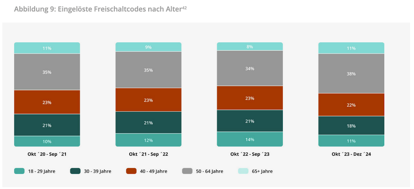 This might be explained by the large share of DiGAs for cardiac diseases and other chronic issues becoming prevalent in later life. Still, technology can clearly reach most generations.