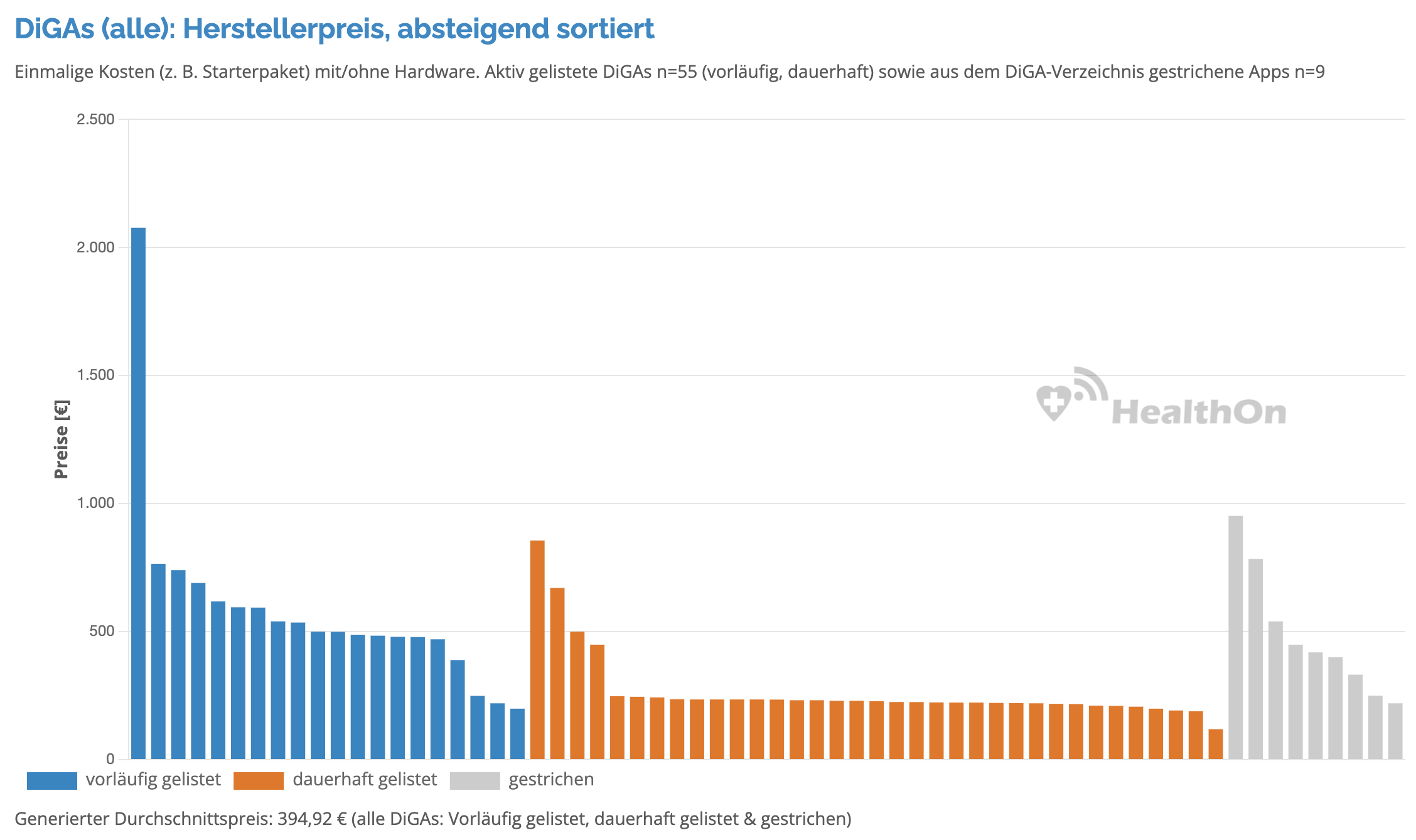 Let's start by looking at reimbursement prices. This overview from HealthOn (they have a convenient DiGA dashboard) includes all indications and sorts by preliminarly listing (blue) and permanent listing (orange).