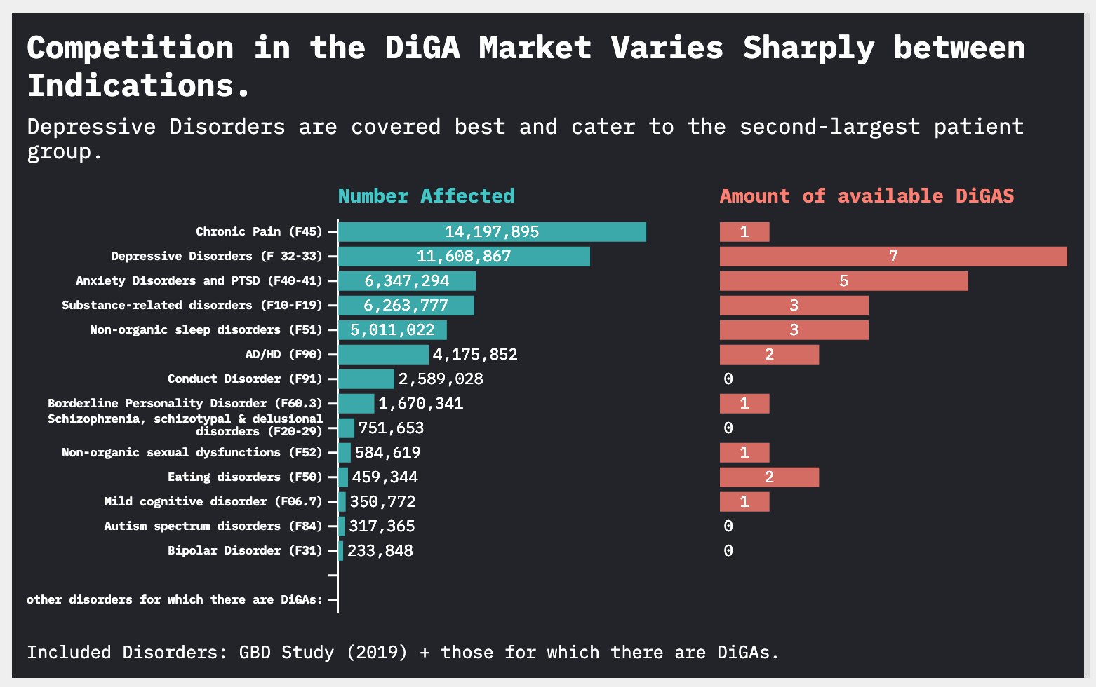 Chronic pain is really the hidden star. There is only one DiGA for that space currently but it has the highest revenue potential. So this will be my answer to the thrid question: Go into chronic pain management DiGAs.