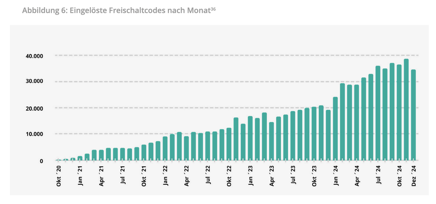 Until end of 2024, roughly 870,000 DiGA-codes have been activated. At this point, well over a 1,000,000 codes have been redemed. Growth has been steady since DiGAs were introduced in 2020, and is still in the high double digits.